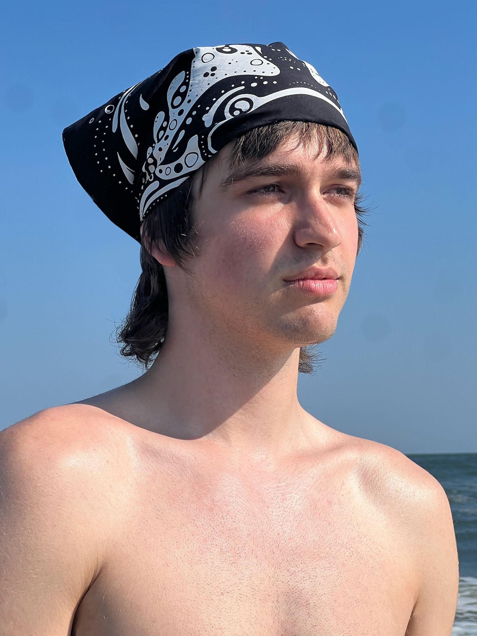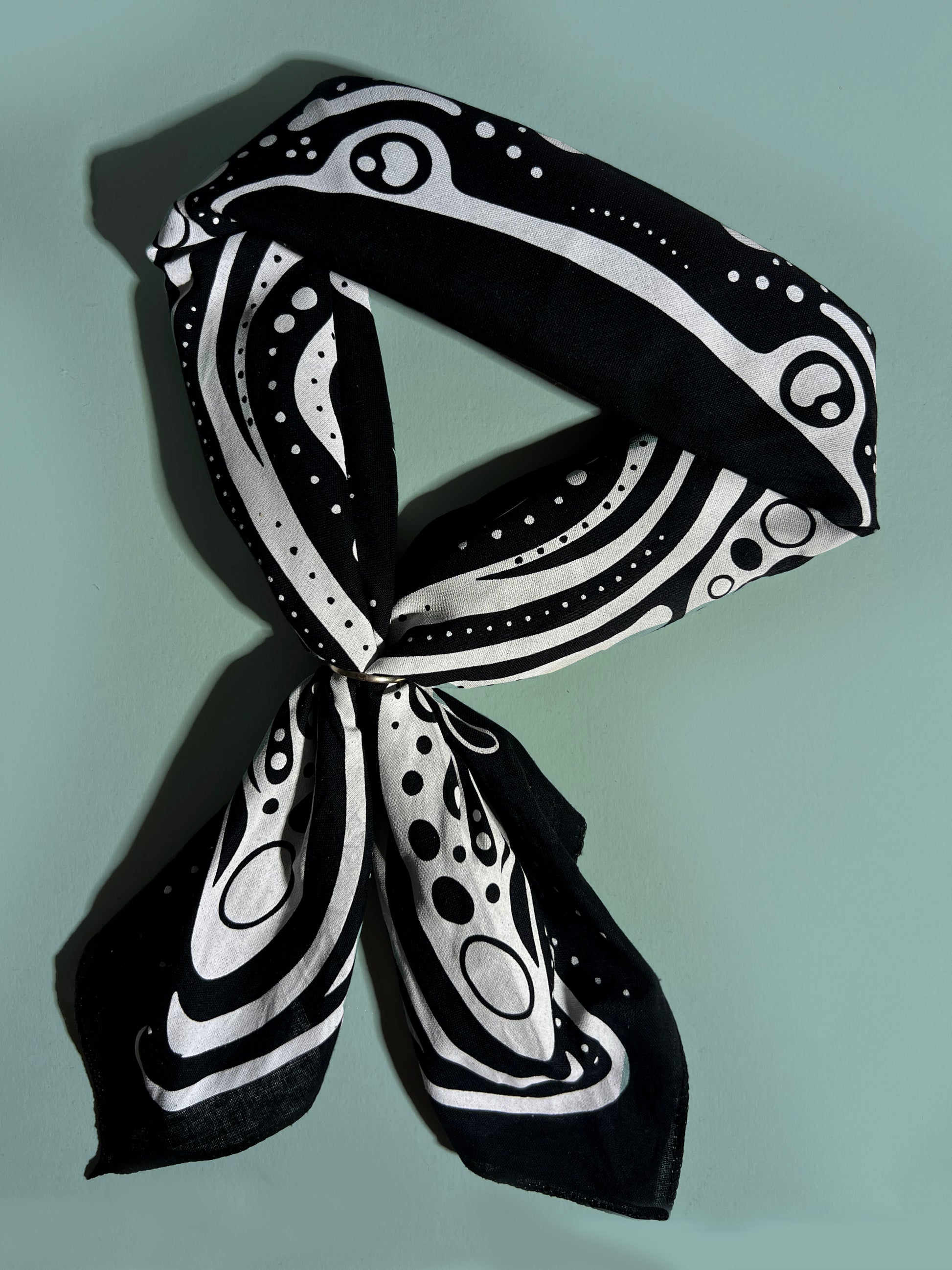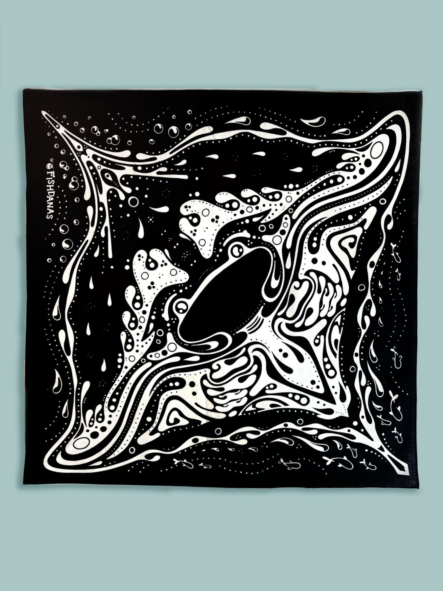 This versatile Manta Ray inspired 100% cotton bandana will match any outfit as a headband, scarf, or belt. It incorporates inky white details on a lightweight black bandana.