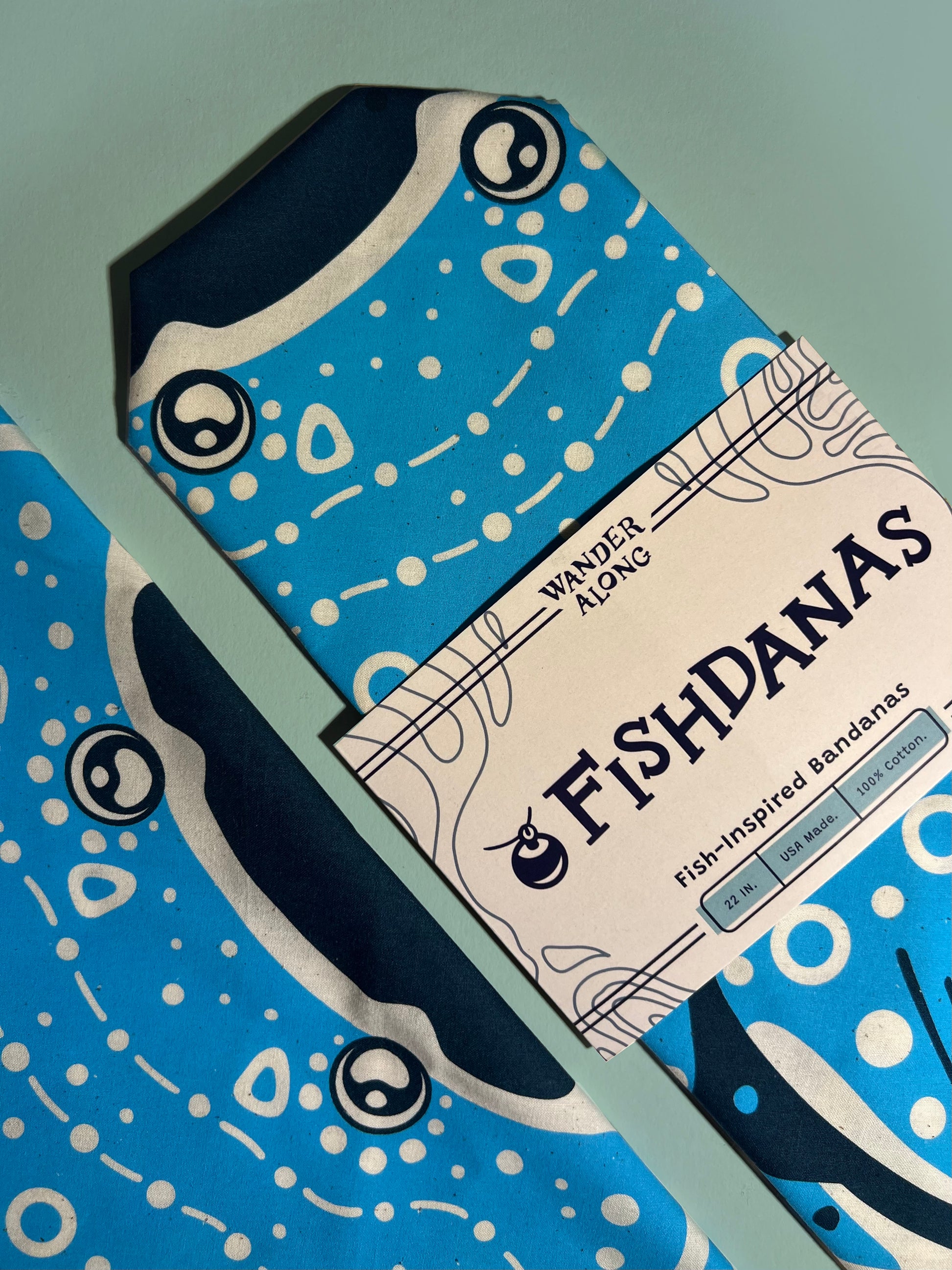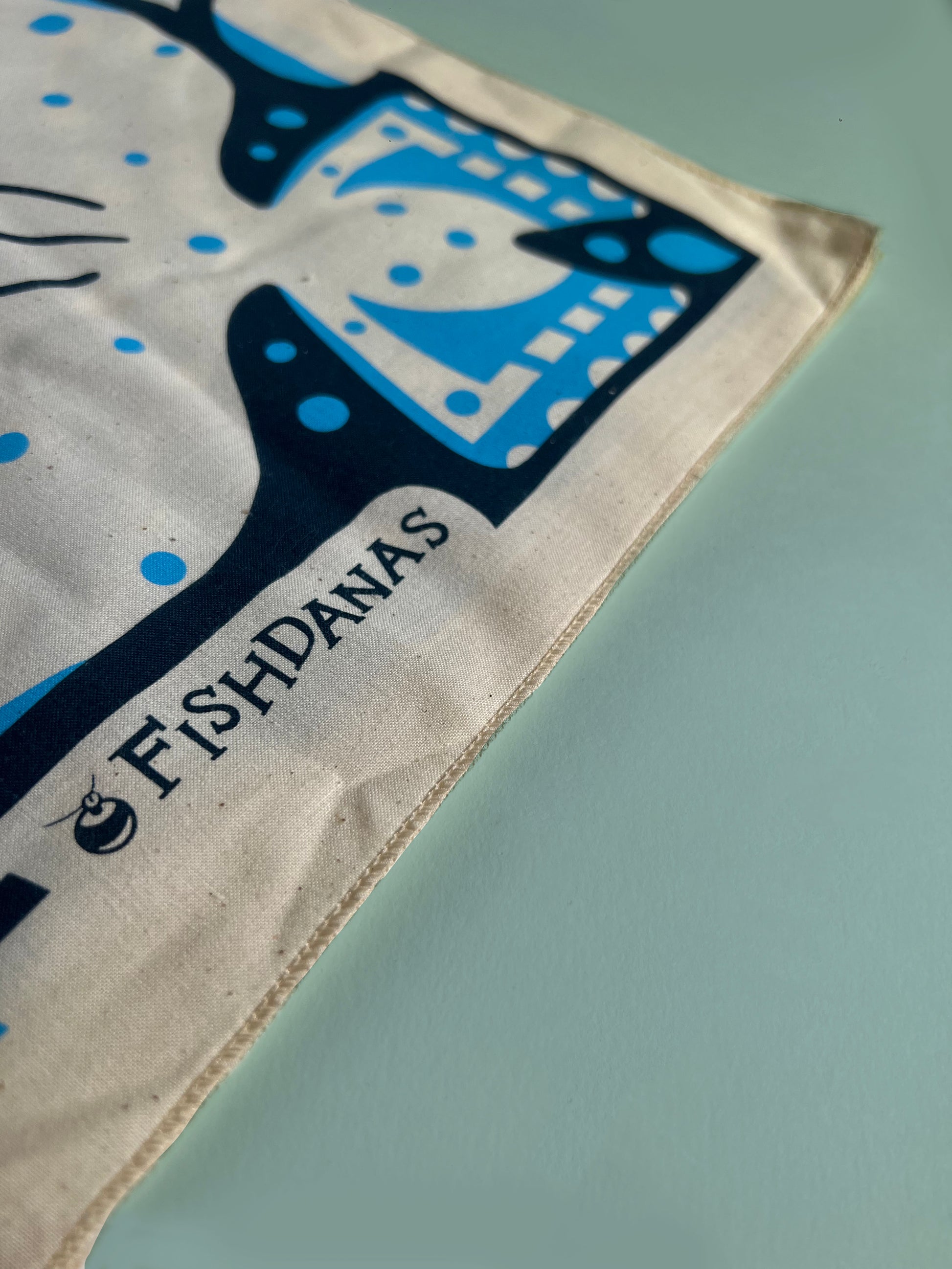 This lightweight, USA made Whale Shark inspired 100% cotton bandana is the cutest whimsical year-round hair accessory. It incorporates both sky blue and and midnight blue details on a natural white bandana.